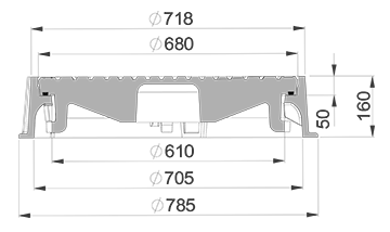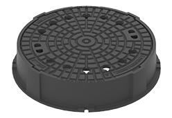 Stacionāra tipa apaļš čuguna rāmis un vāks ar un bez ventilācijas, DN 615/785 mm, ar vāka fiksācijas mehānismu spiediena samazināšanai pretplūdes gadījumā, LVS EN124, RAL-GZ692.