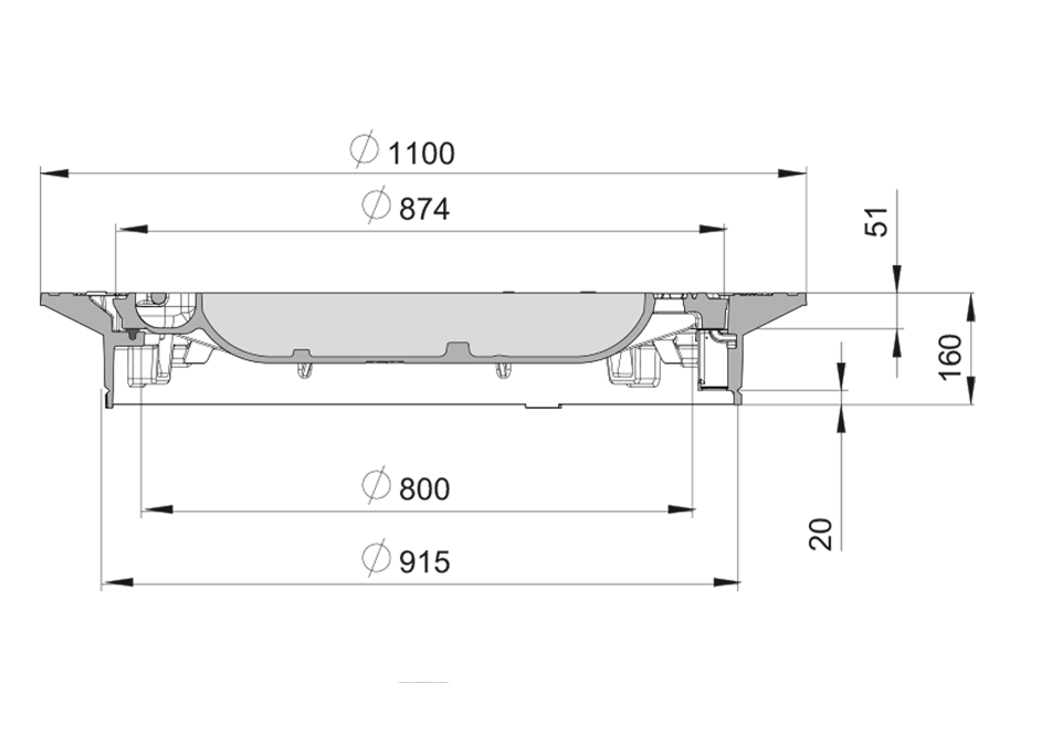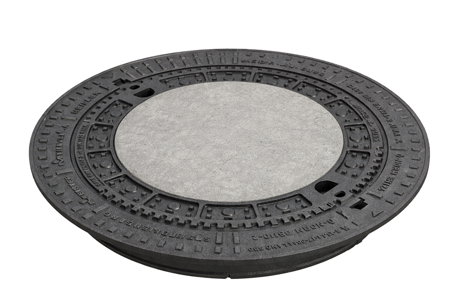 Peldoša tipa vāks ar betonu, DN800 [mm], kakls 915 [mm], liels apkalpes atvērums 800 [mm], LVS EN124, RAL-GZ692. Rāmja ārējais diametrs 1100 [mm].