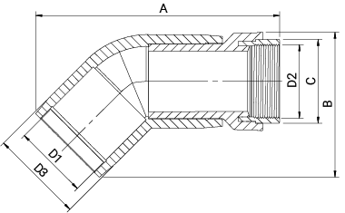 Elektrometināmais līkumi 45° ar misiņa/PE pāreju ir pieejami gan ar ārējo gan iekšējo vītni. Piemēroti gāzes un ūdens vadiem.