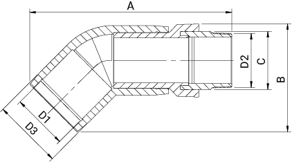 D1 x D2 [mm] C [mm] D3 [mm] A [mm] B [mm] Svars [kg] 20 x ½" 26 35 133 67 0.14 25 x ¾" 32 37 135 71 0.15 32 x 1'' 40 44 145 78 0.22 40 x 1'' 40 56 159 86 0.29 40 x 1¼'' 48 56 167 89 0.34 50 x 1¼'' 55 67 181 98 0.46 63 x 2'' 67 81 207 116 0.68 75 x 2½" 83 93 245 145 1.06 90 x 3'' 96 112 278 165 1.65 110 x 4'' 122 135 308 189 2.44 125 x 4'' 122 151 327 210 2.79 -