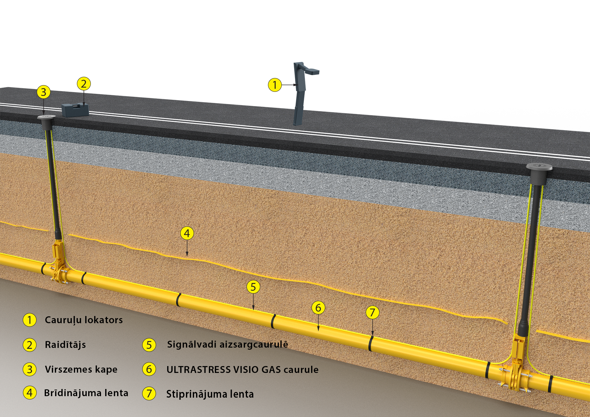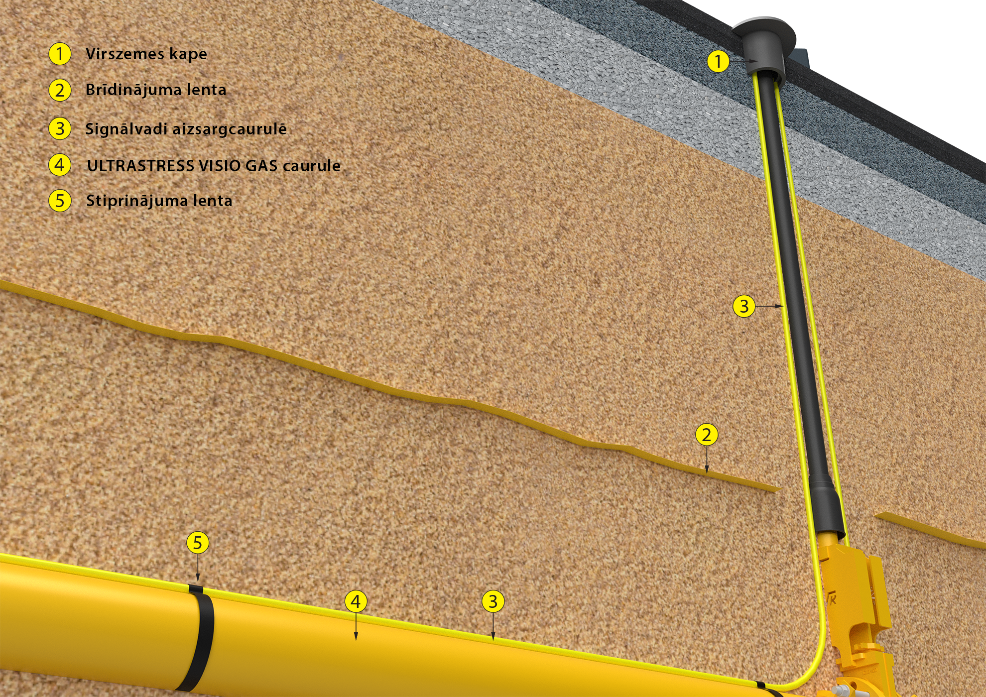 Izmantojama kopā ar ULTRASTRESS VISIO GAS vai ULTRASTRESS PROTECT GAS gāzes apgādes caurulēm. Izbūvējama tranšejā tieši virs cauruļvada līnijas komplektā ar brīdinājuma lentu.