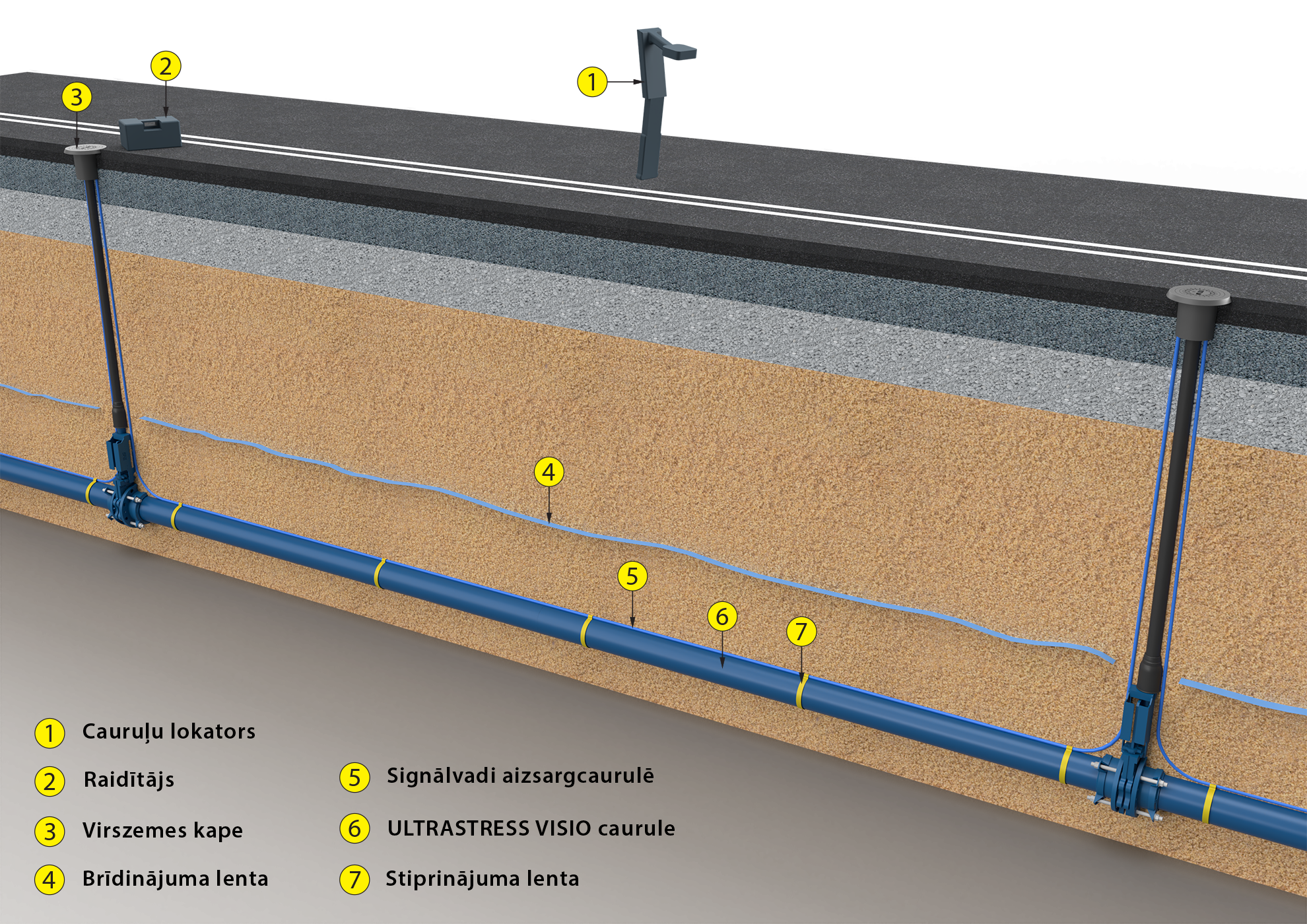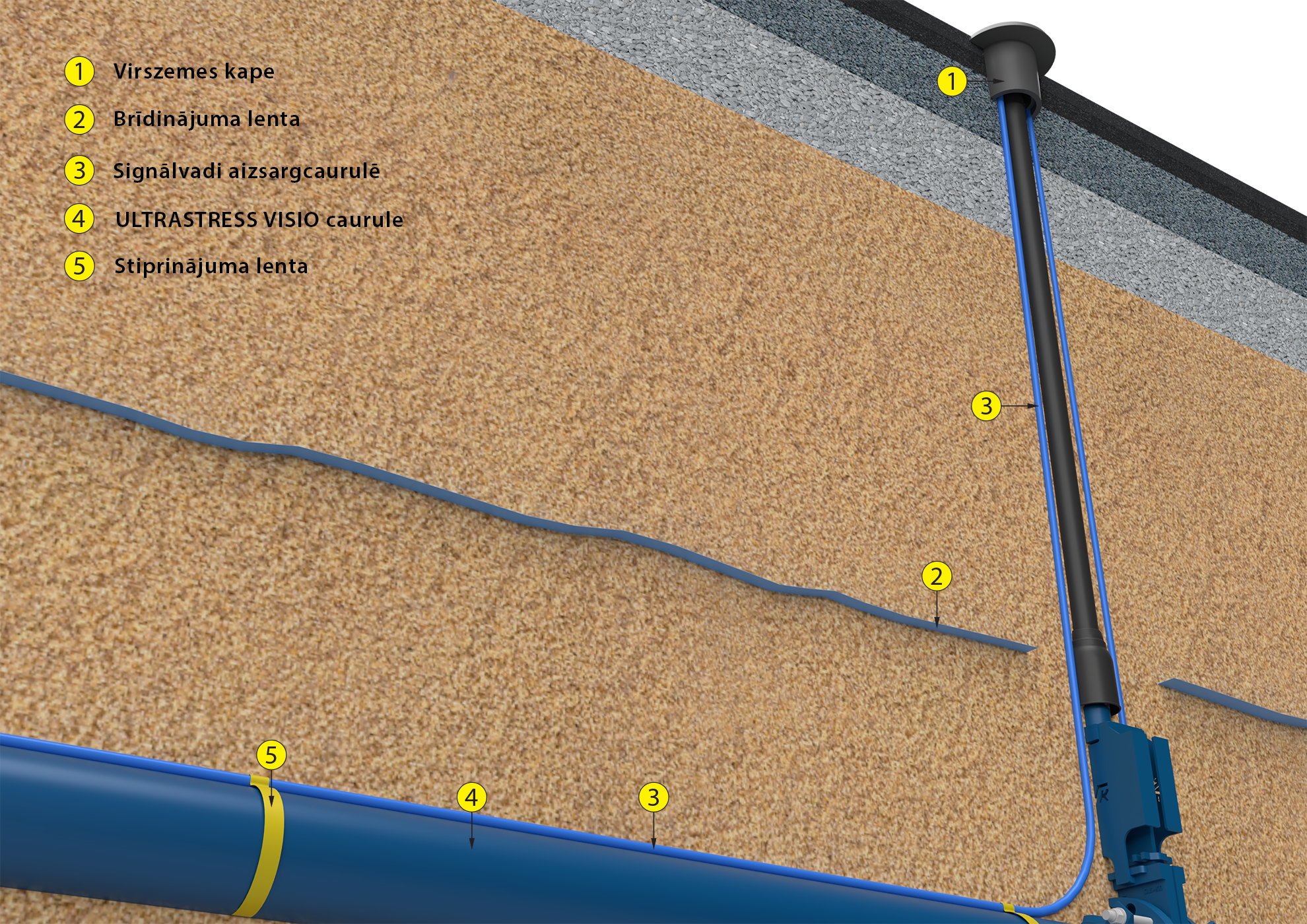 Izmantojama kopā ar ULTRASTRESS VISIO, ULTRASTRESS PROTECT vai EVOAQUA ūdensvadu vai kanalizācijas spiedvadu caurulēm. Izbūvējama tranšejā tieši virs cauruļvada līnijas komplektā ar brīdinājuma lentu.
